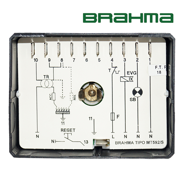 Programador de llama Brahma MT 592/S para quemadores de gas. Control seguro y eficiente y uso de un solo electrodo para encendido e ionización. Ideal para aplicaciones industriales.